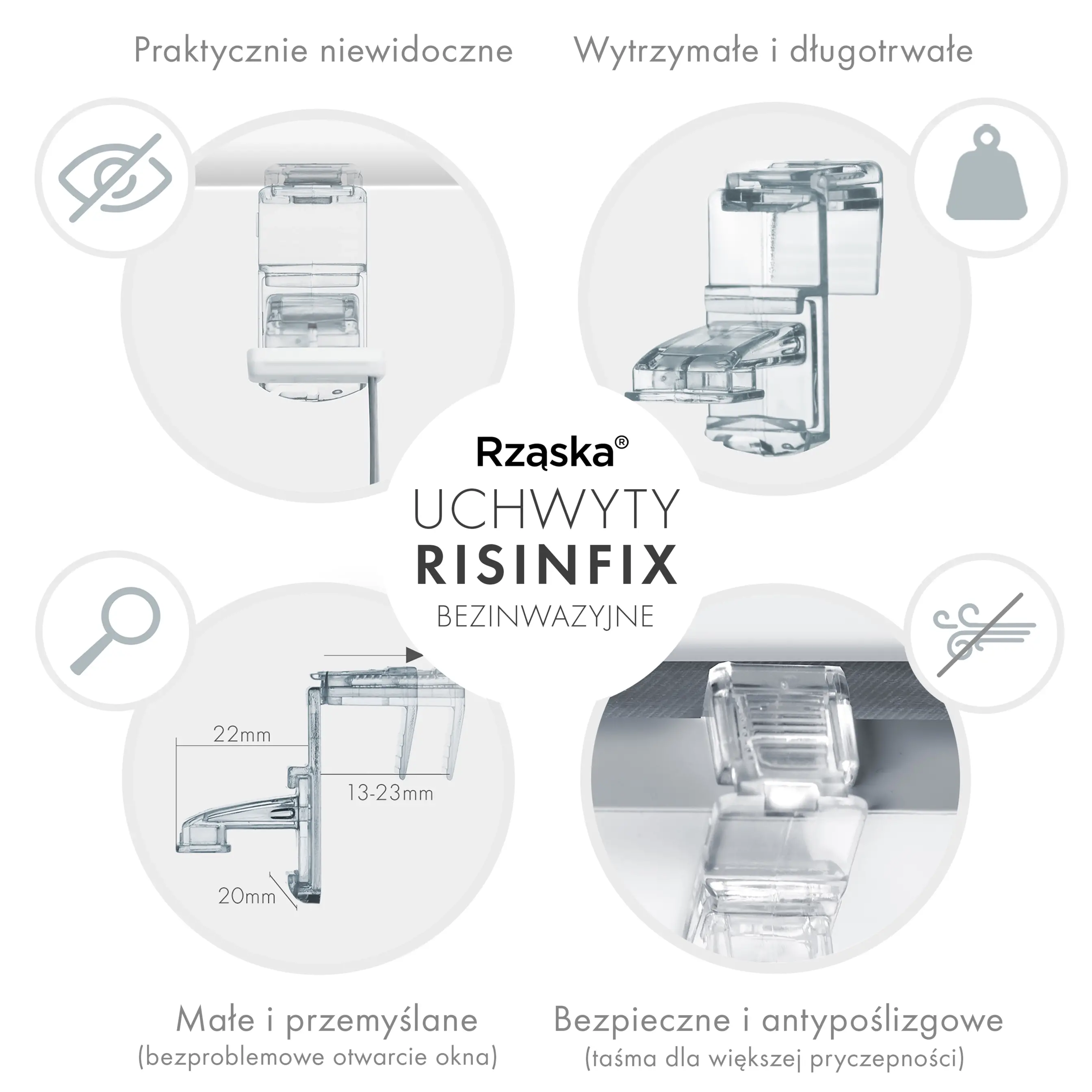 W przeciwieństwie do systemu inwazyjnego, w systemie bezinwazyjnym nie ma konieczności wiercenia otworów w ramie okna. System bezinwazyjny oferuje łatwość montażu, za pośrednictwem uchwytów zaciskowych, które montuje się u góry i dołu ramy okna.