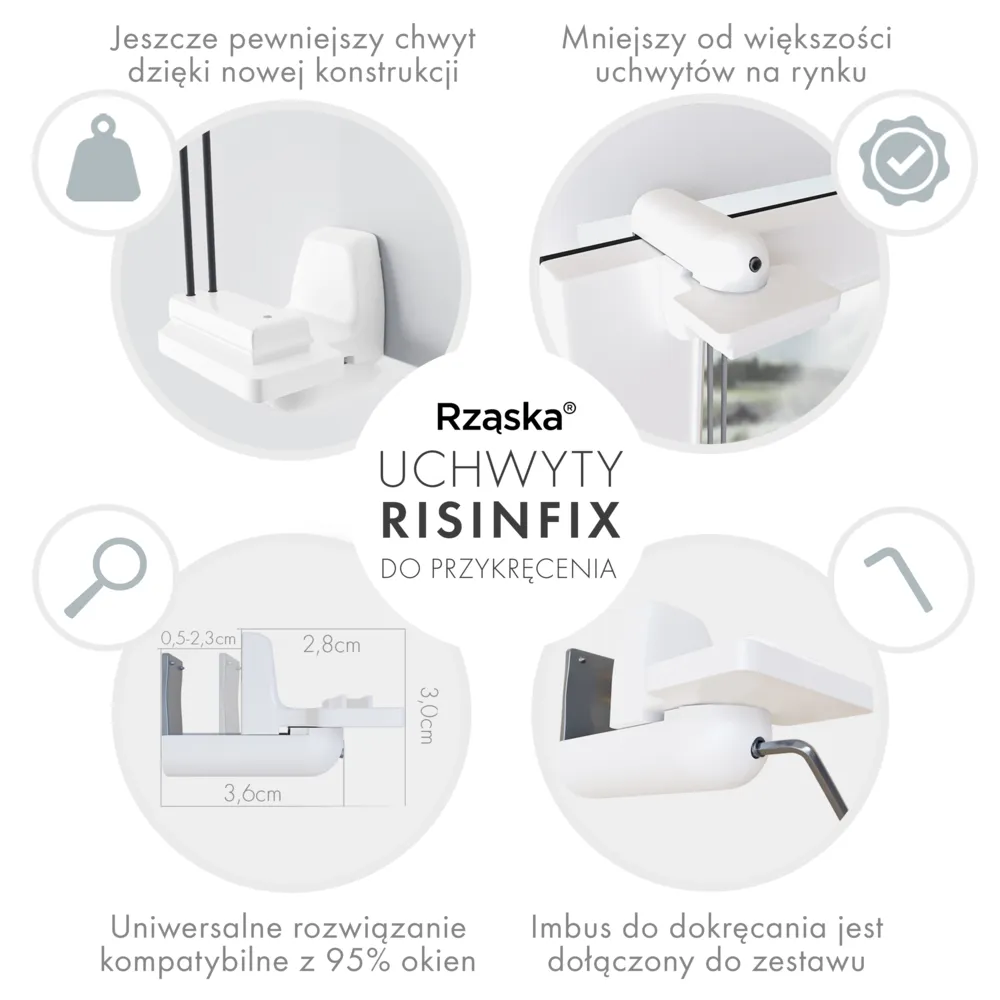 Mocowania Risinfix do zaciskania na imbus charakteryzują się dużą trwałością. Mocuje się je skręcając zacisk na ramie okna za pomocą śruby imbusowej z użyciem klucza dołączonego w zestawie. Zalety: