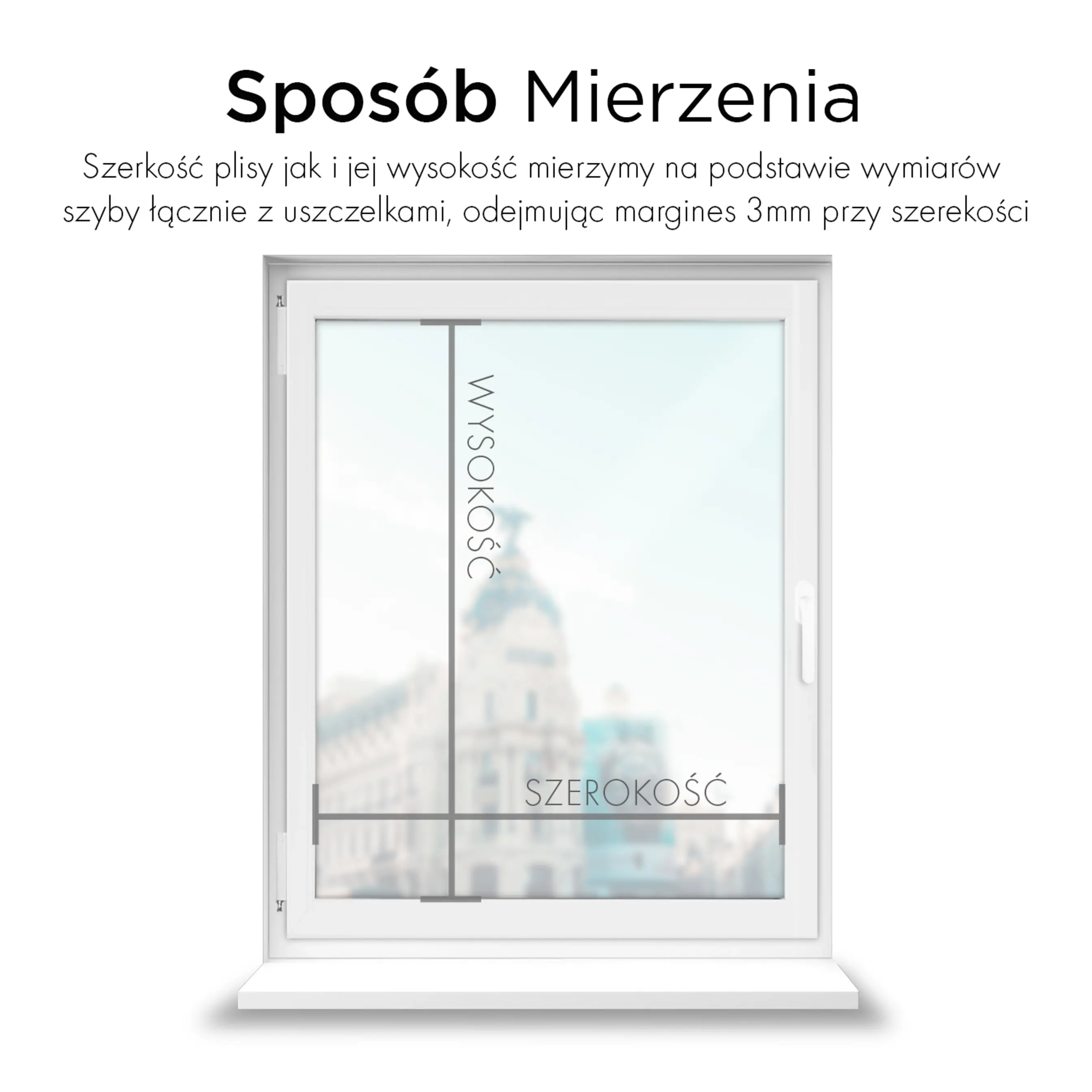 - pomiar wysokości: wysokość należy zmierzyć od górnej do dolnej krawędzi ramy okna.
