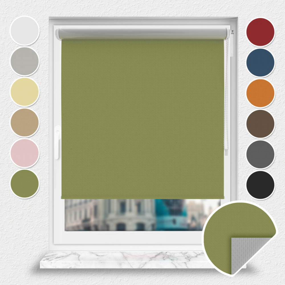 Roleta zaciemniająca Rząska® na wymiar, kolekcja Thermo, uchwyty bezinwazyjne i inwazyjne 2w1 w kolorze Oliwa europejska, zielonym z profilem białym.