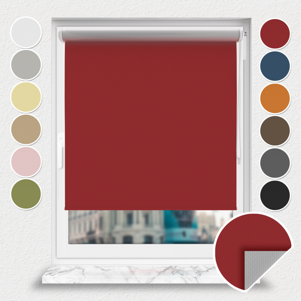 Roleta zaciemniająca Rząska® na wymiar, kolekcja Thermo, uchwyty bezinwazyjne i inwazyjne 2w1 w kolorze Wiśniowe cukierki, czerwonym z profilem białym.
