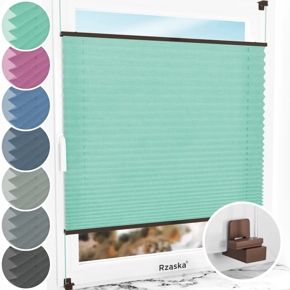 Rząska® bezinwazyjne plisy do okien na wymiar • mocowania Risinfix do zaciskania • kolekcja Melange: kolor tkaniny Miętowe lody, zielony • kolor profili orzech