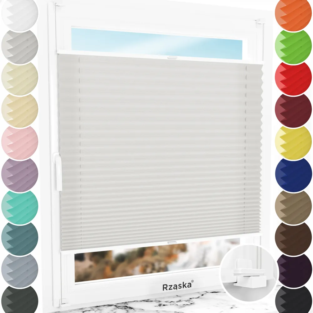 - Montaż: uchwyt do plisy Rząska® Risinfix do zaciskania: gwarantuje wytrzymałość i elastyczność. Praktycznie niewidoczny i pasujący do każdego koloru okna, mały i dobrze przemyślany (nieszkodliwy dla gumowych uszczelek i najlepiej zapobiegający przeciągom i syczeniu powietrza). Zapewnia łatwy i szybki montaż poniżej 3 minut bez użycia dodatkowych narzędzi. Uchwyt posiada solidny i antypoślizgowy chwyt, a dodatkowe podkładki samoprzylepne zapewniają stabilność.