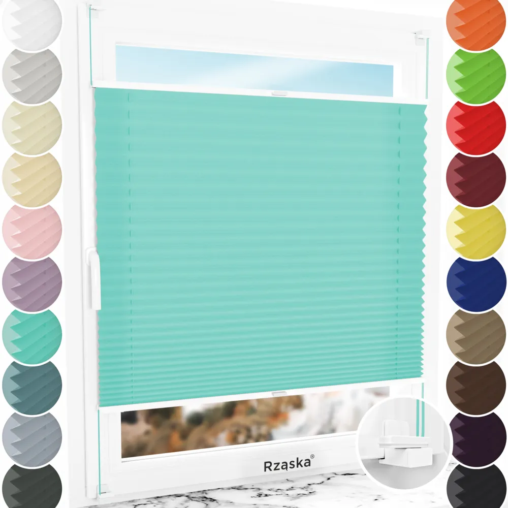 Rząska® bezinwazyjne plisy do okien na wymiar • mocowania Risinfix do zaciskania • kolekcja Premium: kolor tkaniny Błękitny ocean, turkusowy • kolor profili biały