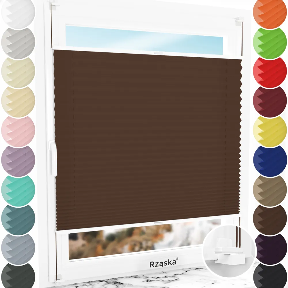 Rząska® bezinwazyjne plisy do okien na wymiar • mocowania Risinfix do zaciskania • kolekcja Premium: kolor tkaniny Gorąca czekolada, ciemnego brązu • kolor profili biały