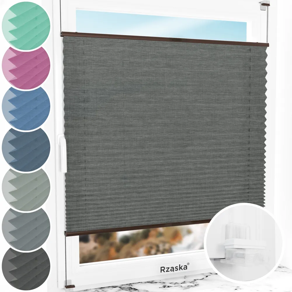 Rząska® bezinwazyjne plisy okienne na wymiar • mocowania Risinfix do zaciskania • kolekcja Melange: kolor tkaniny Czarna perła, czarny • kolor profili brązowy