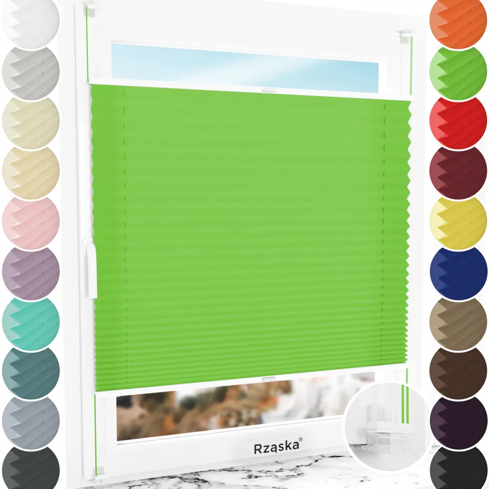 Rząska® bezinwazyjne plisy okienne na wymiar • mocowania Risinfix do zaciskania • kolekcja Premium: kolor tkaniny Zielona łąka, zielony • kolor profili biały