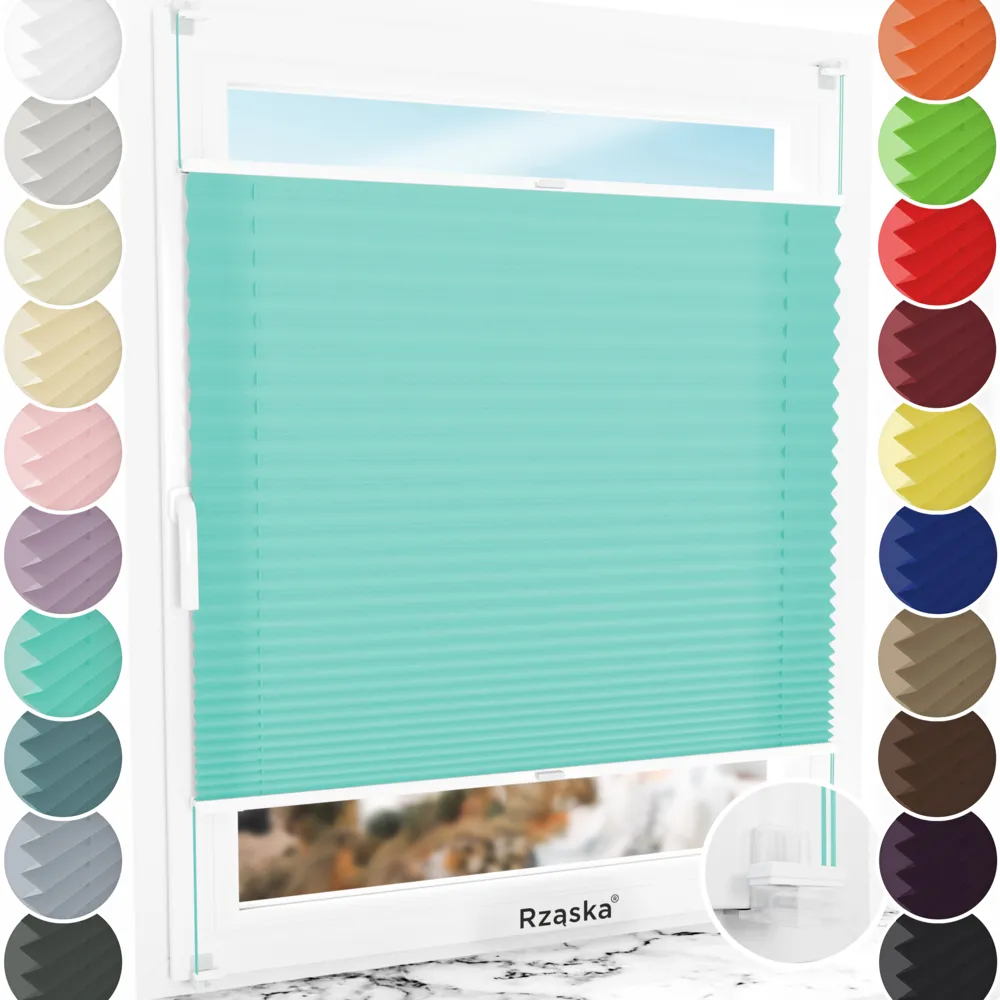 Rząska® bezinwazyjne plisy okienne na wymiar • mocowania Risinfix do zaciskania • kolekcja Premium: kolor tkaniny Błękitny ocean, turkusowy • kolor profili biały