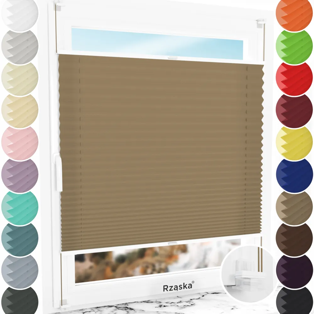 Rząska® bezinwazyjne plisy okienne na wymiar • mocowania Risinfix do zaciskania • kolekcja Premium: kolor tkaniny Poranna kawa, jasnobrązowy • kolor profili biały
