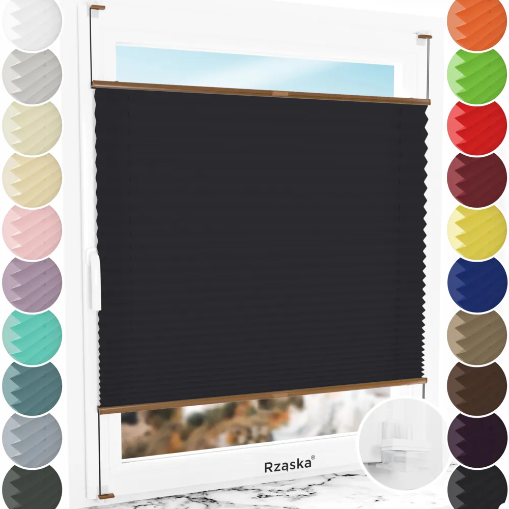 Rząska® bezinwazyjne plisy okienne na wymiar • mocowania Risinfix do zaciskania • kolekcja Premium: kolor tkaniny Śląski węgiel, czarny • kolor profili dąb