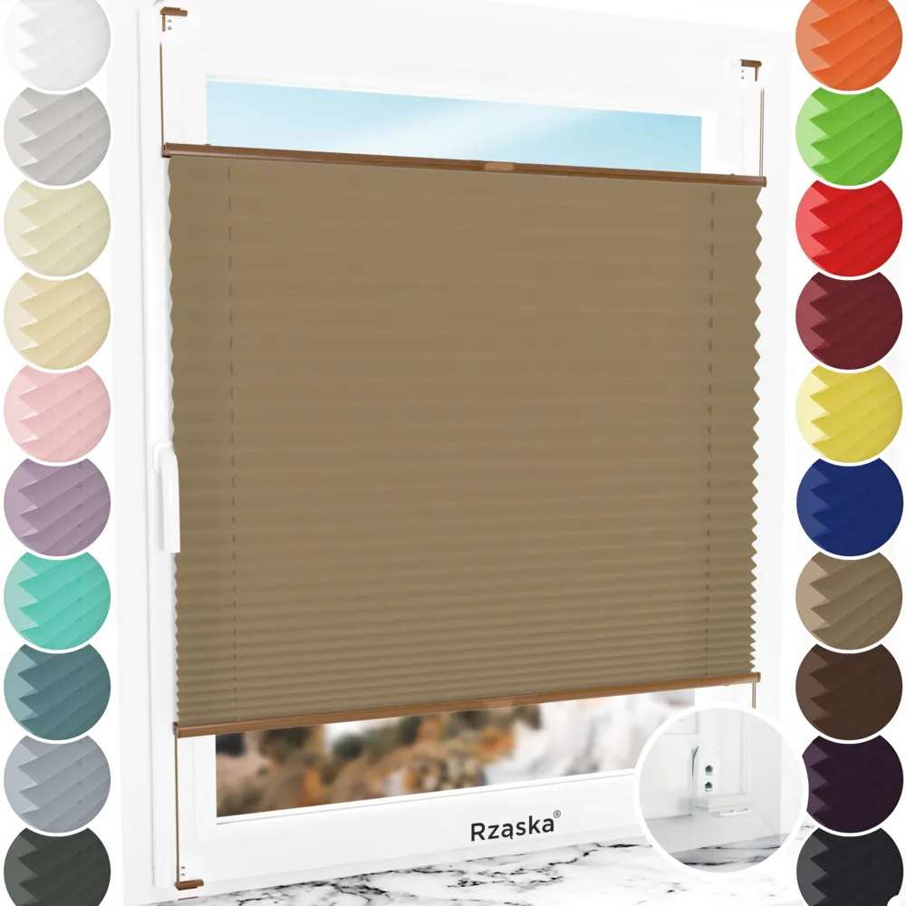 Rząska® bezinwazyjne plisy okienne na wymiar • mocowania Risinfix Double 2w1 • kolekcja Premium: kolor tkaniny Poranna kawa, jasnobrązowy • kolor profili dąb