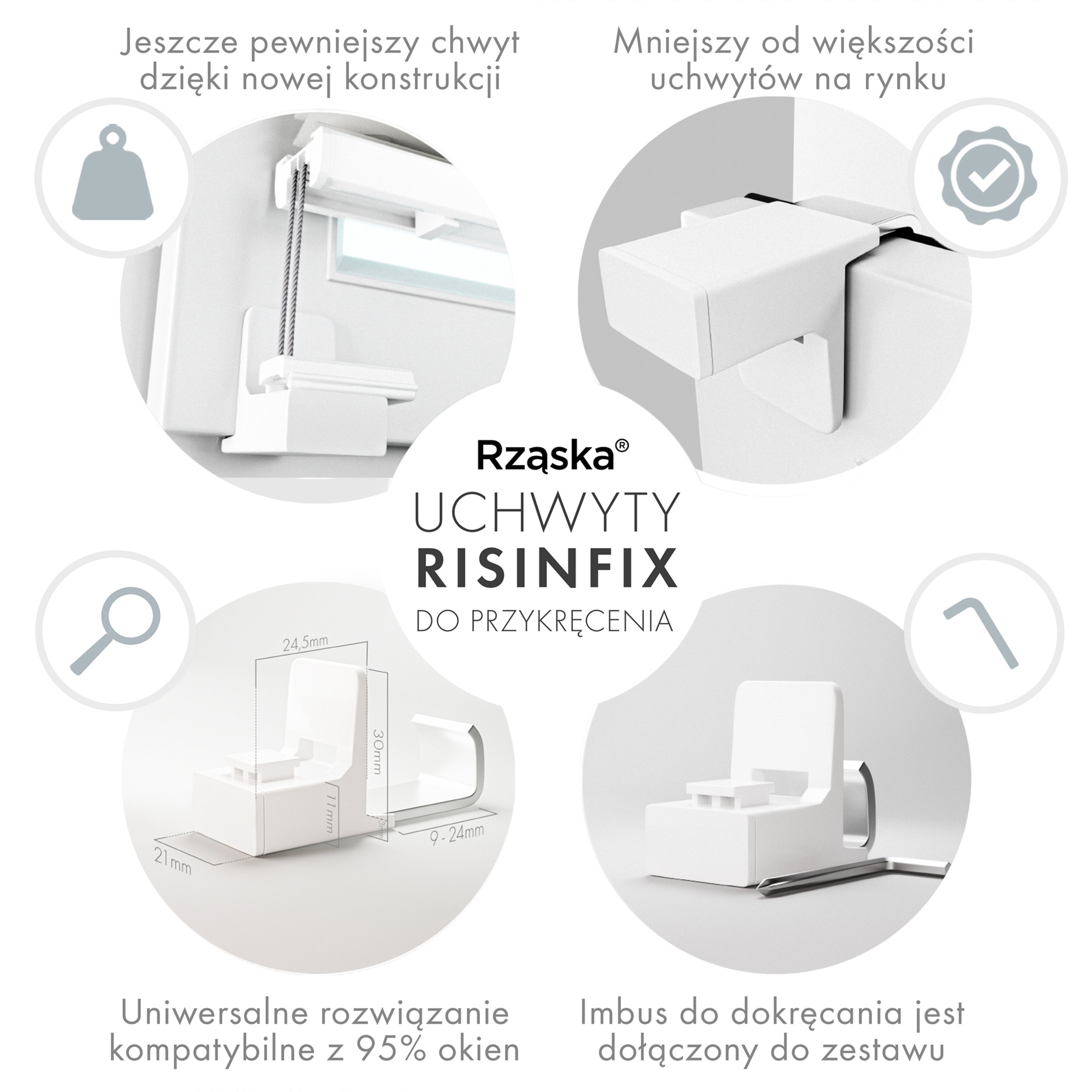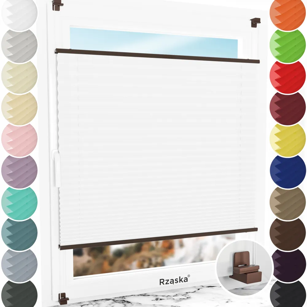 - Montaż: uchwyt do plisy Rząska® Risinfix do zaciskania: gwarantuje wytrzymałość i elastyczność. Praktycznie niewidoczny i pasujący do każdego koloru okna, mały i dobrze przemyślany (nieszkodliwy dla gumowych uszczelek i najlepiej zapobiegający przeciągom i syczeniu powietrza). Zapewnia łatwy i szybki montaż poniżej 3 minut bez użycia dodatkowych narzędzi. Uchwyt posiada solidny i antypoślizgowy chwyt, a dodatkowe podkładki samoprzylepne zapewniają stabilność.