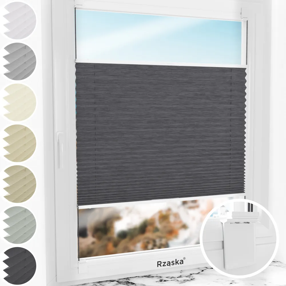 Rząska® bezinwazyjne rolety plisowane na wymiar • mocowania Risnifix do klejenia 2w1 • kolekcja Dolomite: kolor tkaniny Ciemny vintage, szary • kolor profili biały