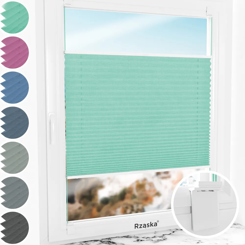 Rząska® bezinwazyjne rolety plisowane na wymiar • mocowania Risnifix do klejenia 2w1 • kolekcja Melange: kolor tkaniny Miętowe lody, zielony • kolor profili orzech