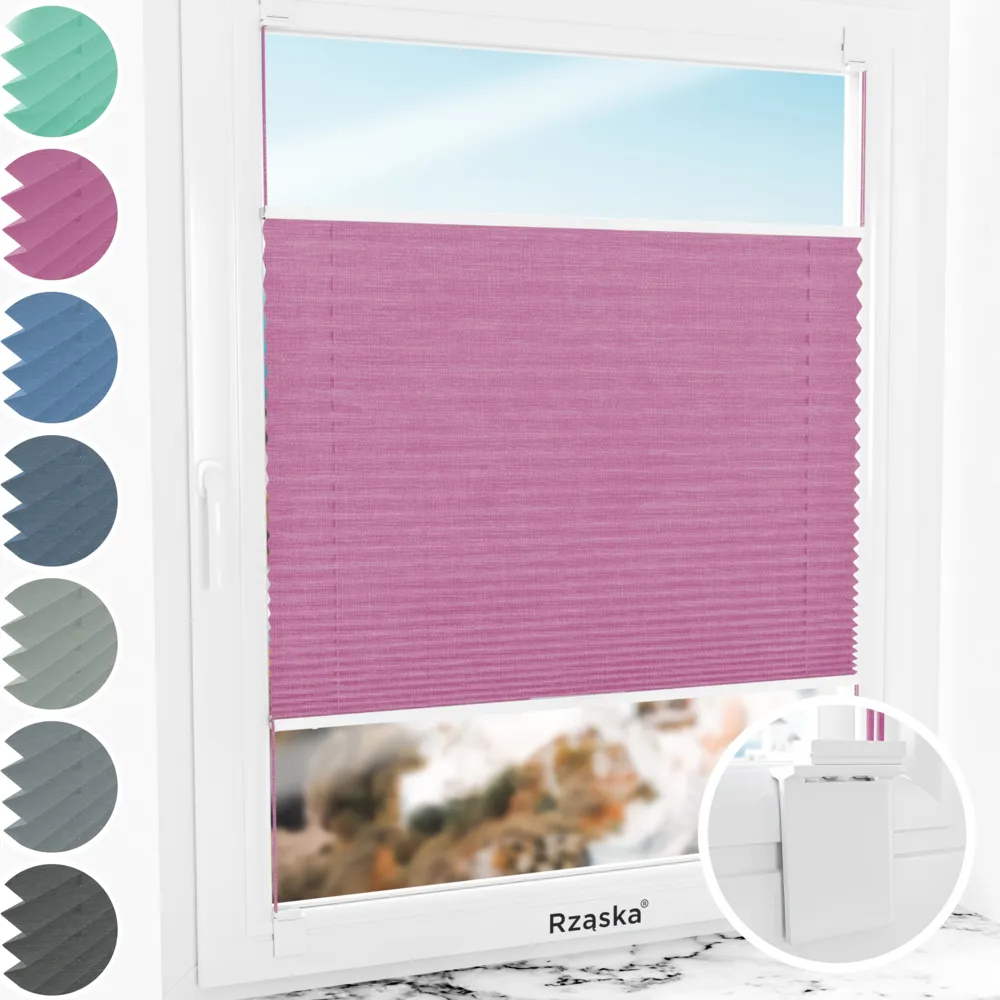 Rząska® bezinwazyjne rolety plisowane na wymiar • mocowania Risnifix do klejenia 2w1 • kolekcja Melange: kolor tkaniny Magiczny róż, różowy • kolor profili biały
