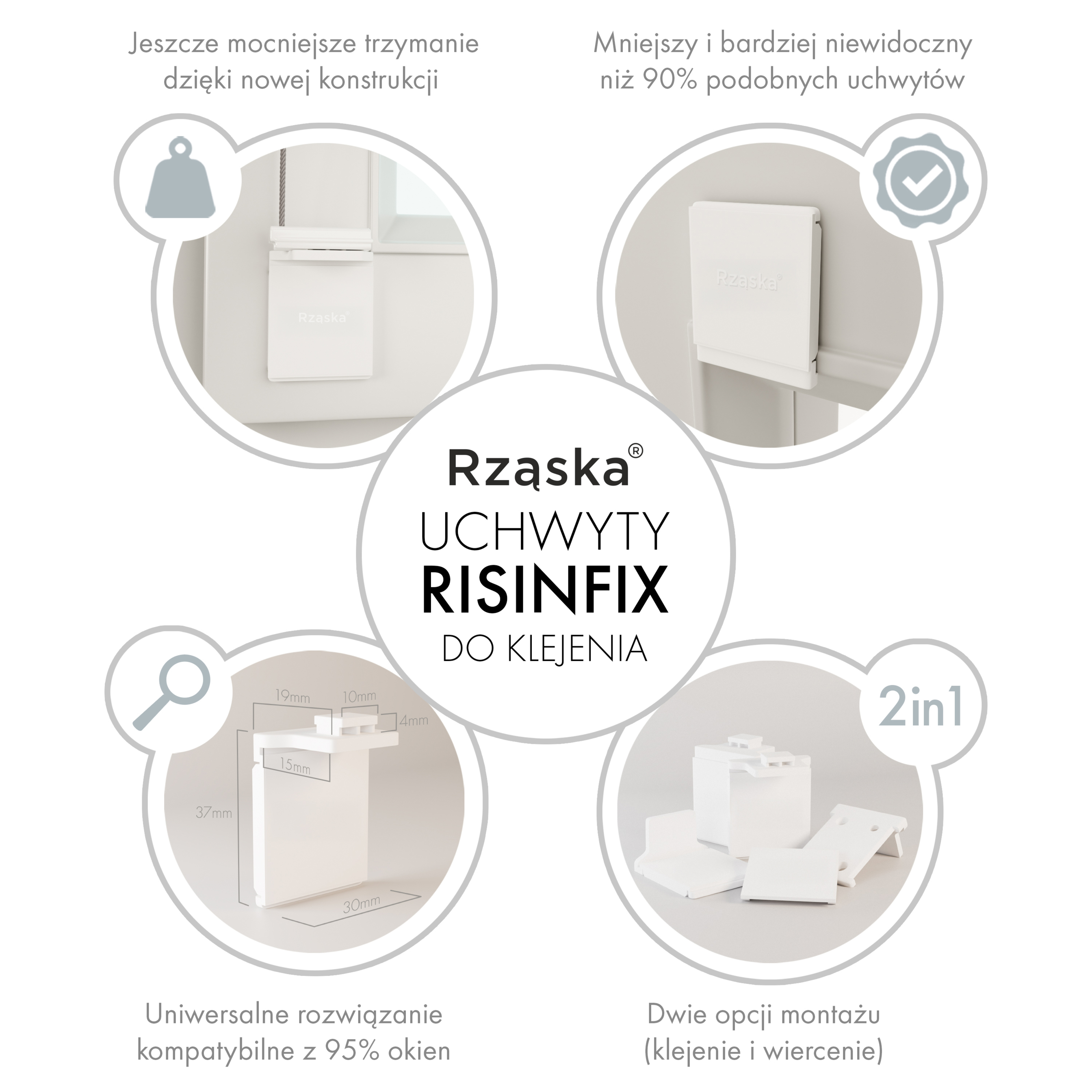 - NOWOŚĆ! Mocowania Risinfix do klejenia 2w1: Mocniejsze, mniejsze, bardziej dyskretne i kompatybilne ze wszystkimi plisami Rząska®! Przezroczyste (praktycznie niewidoczne i pasujące do każdego koloru okna), a przy tym małe i przemyślane. Montaż w mniej niż 3 minuty, bez wiercenia i bez użycia narzędzi (wszystko jest w zestawie).