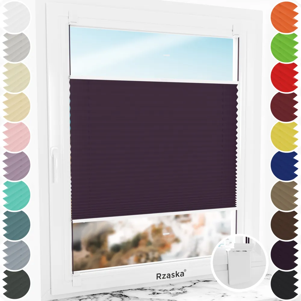 Rząska® bezinwazyjne rolety plisowane na wymiar • mocowania Risnifix do klejenia 2w1 • kolekcja Premium: kolor tkaniny Muza północy, flioletowy • kolor profili biały