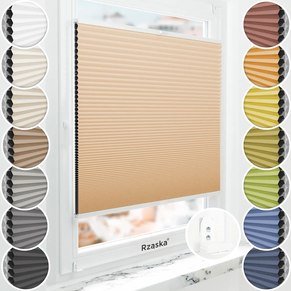 • Tkanina plisowana: tkanina posiada certyfikat Oeko-Tex, jest wykonana z podwójnej struktury komórkowej, wzbogacona o innowacyjną srebrną powłoką termoizolacyjną wewnątrz komórek. Tkanina całkowicie blokuje dostęp światła, skutecznie chroniąc przed nasłonecznieniem. Dzięki ukrytym sznurkom napinającym fałdy układają się idealnie równo, bez widocznych otworów. Zastosowana ochrona UV zapobiega blaknięciu. Nieprzeźroczysta, tkanina zapewnia ochronę UV przed blaknięciem, a kolory są w pełni autorsko opracowane i delikatnie barwione – z przodu kolorowe, a z tyłu białe.