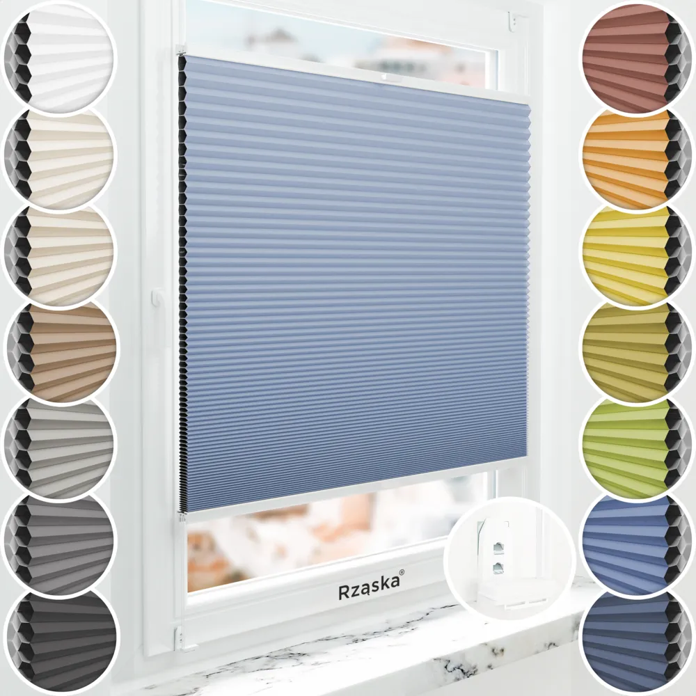 • Tkanina plisowana: tkanina posiada certyfikat Oeko-Tex, jest wykonana z podwójnej struktury komórkowej, wzbogacona o innowacyjną srebrną powłoką termoizolacyjną wewnątrz komórek. Tkanina całkowicie blokuje dostęp światła, skutecznie chroniąc przed nasłonecznieniem. Dzięki ukrytym sznurkom napinającym fałdy układają się idealnie równo, bez widocznych otworów. Zastosowana ochrona UV zapobiega blaknięciu. Nieprzeźroczysta, tkanina zapewnia ochronę UV przed blaknięciem, a kolory są w pełni autorsko opracowane i delikatnie barwione – z przodu kolorowe, a z tyłu białe.