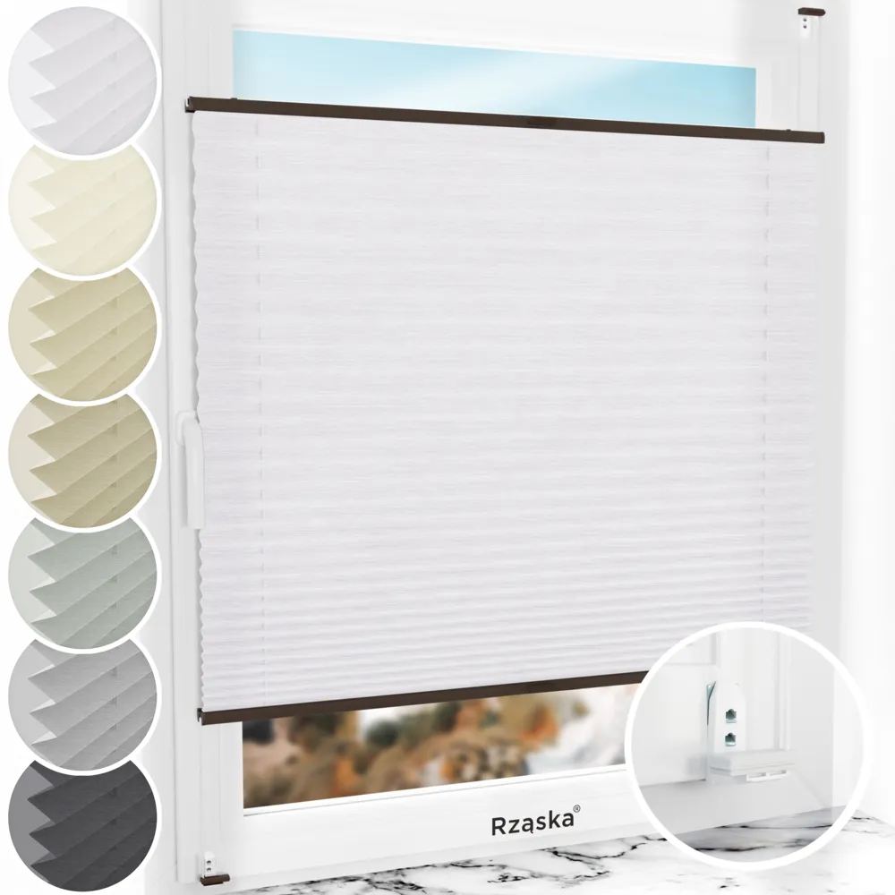- Cechy inwazyjnej rolety plisowanej Rząska®: Płynna regulacja (góra/dół), podwójne sznurowanie (większa stabilność), specjalistyczne profile aluminiowe (bez wyginania/łamania), wstępnie złożona (brak potrzeby przewlekania sznurków rolety ani czasochłonnego montażu wielu pojedynczych części).
