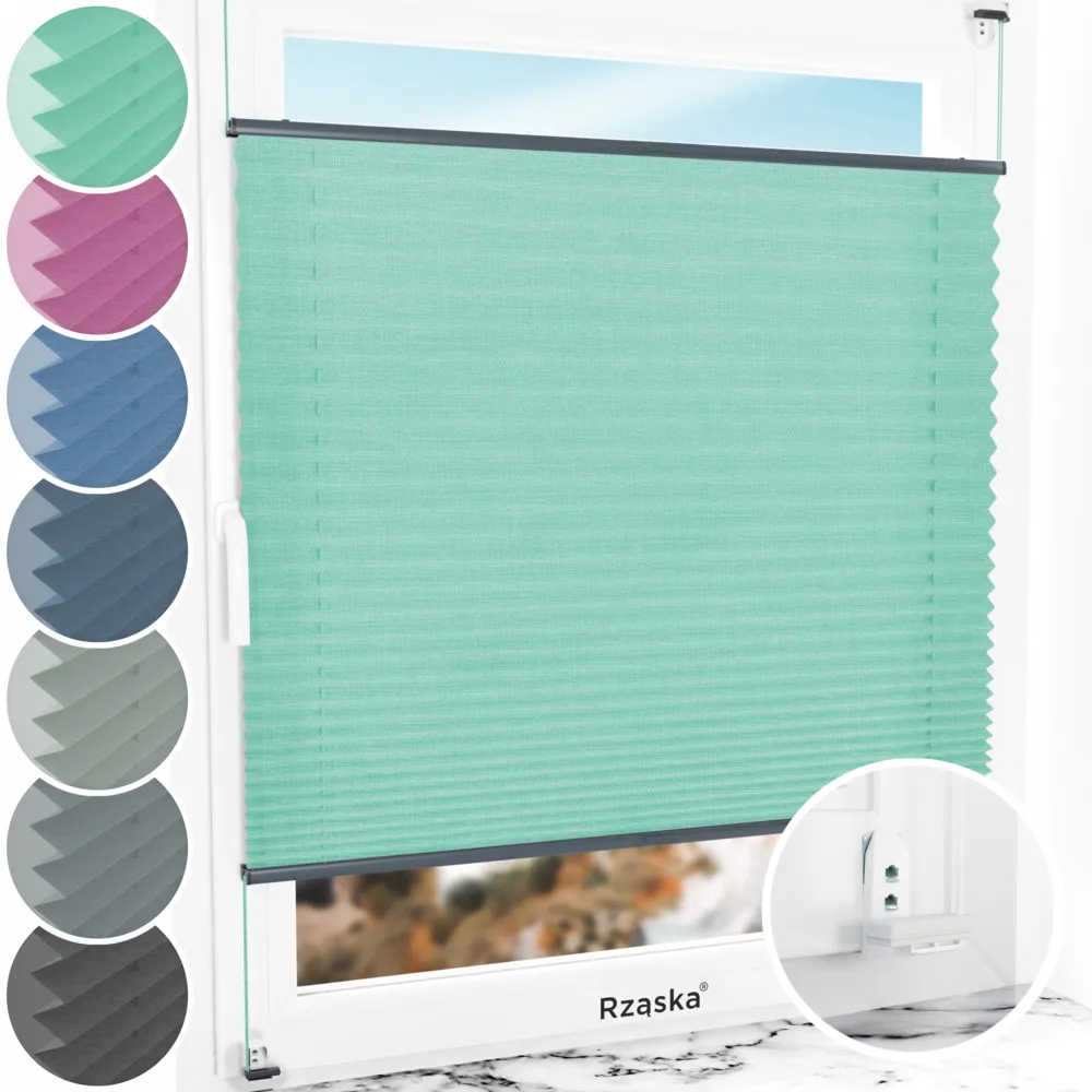 Rząska® inwazyjne rolety plisowane na wymiar • mocowania Risinfix Double 2w1 • kolekcja Melange: kolor tkaniny Miętowe lody, zielony • kolor profili antracyt