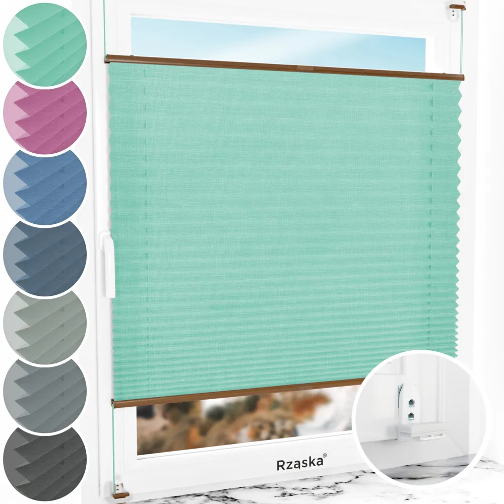 Rząska® inwazyjne rolety plisowane na wymiar • mocowania Risinfix Double 2w1 • kolekcja Melange: kolor tkaniny Miętowe lody, zielony • kolor profili dąb