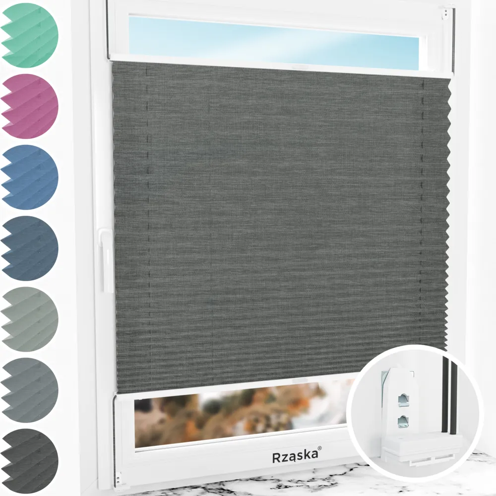 Rząska® inwazyjne rolety plisowane na wymiar • mocowania Risinfix Double 2w1 • kolekcja Melange: kolor tkaniny Czarna perła, czarny • kolor profili biały