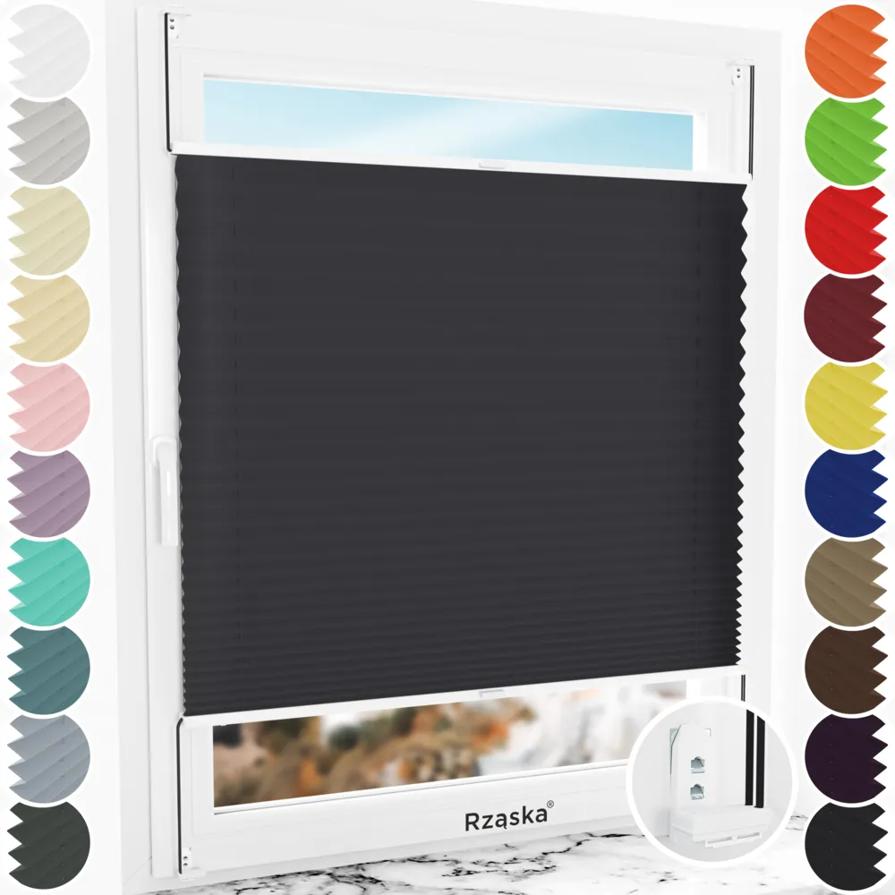 Rząska® inwazyjne rolety plisowane na wymiar • mocowania Risinfix Double 2w1 • kolekcja Premium: kolor tkaniny Śląski węgiel, czarny • kolor profili biały