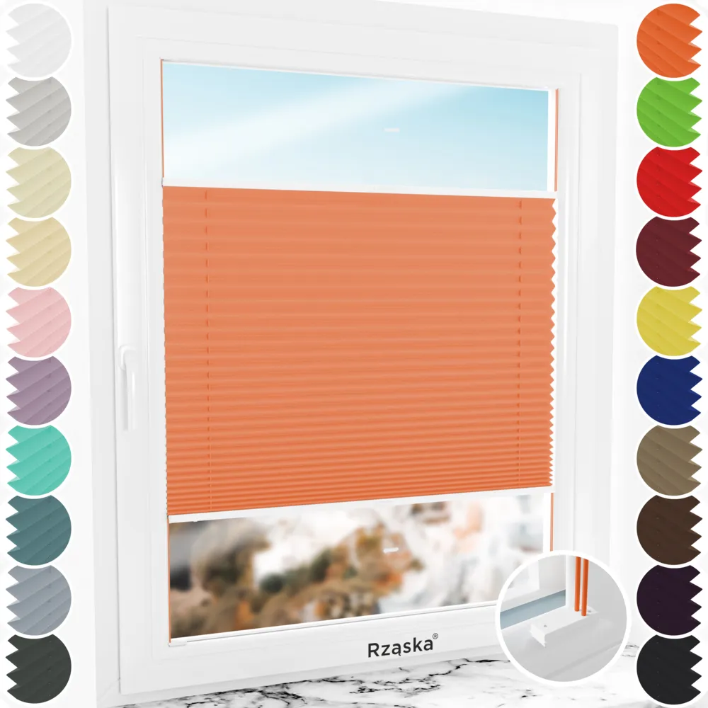 - Cechy inwazyjnej rolety plisowanej Rząska®: Płynna regulacja (góra/dół), podwójne sznurowanie (większa stabilność), profile aluminiowe (bez wyginania/łamania), wstępnie złożona (brak potrzeby przewlekania sznurków rolety ani czasochłonnego montażu wielu pojedynczych części).