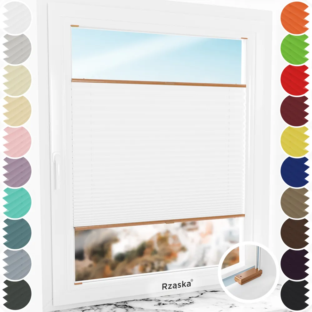 Inwazyjne rolety plisowane zaciemniajace Rząska® na wymiar, uchwyty Risinfix do przykręcania, kolekcja Thermo w kolorze Białe święto, białym z profilem dębowym.