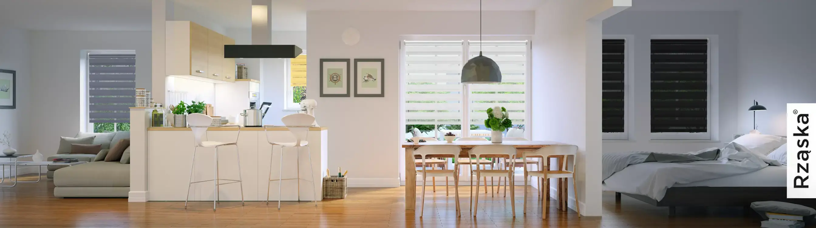 Nowoczesne rolety Rząska® na wymiar, kolekcja Dzień i Noc, uchwyty bezinwazyjne i inwazyjne 2w1 w kolorze Biały śnieg, białym z profilem białym.